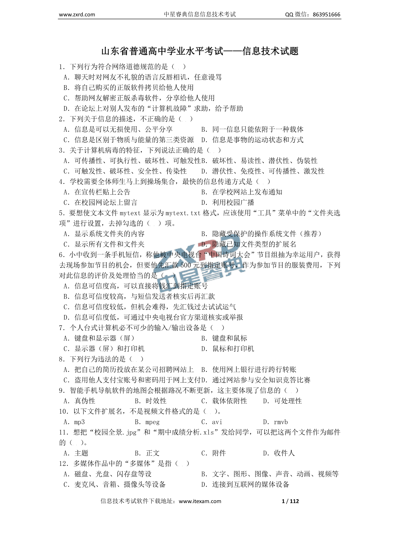 2019年山东省普通高中学业水平考试信息技术试题(一)