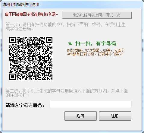 用手机扫上面的二维码就可以得到字母注册码。填入注册就可以。
