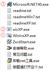 在windowsXp系统下,要先安装WinInsXP①,再安装wicXP②,最后安装Microsot.NET40③。