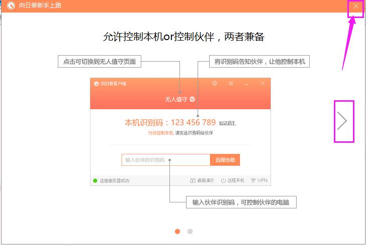 安装完成后,会出现向日葵新手上路界面,点“关闭”按钮关闭就可以了。